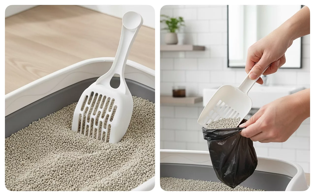 The scoop hangs on the side so I never lose it. It’s easy to grab and clean up right after my cat is done.