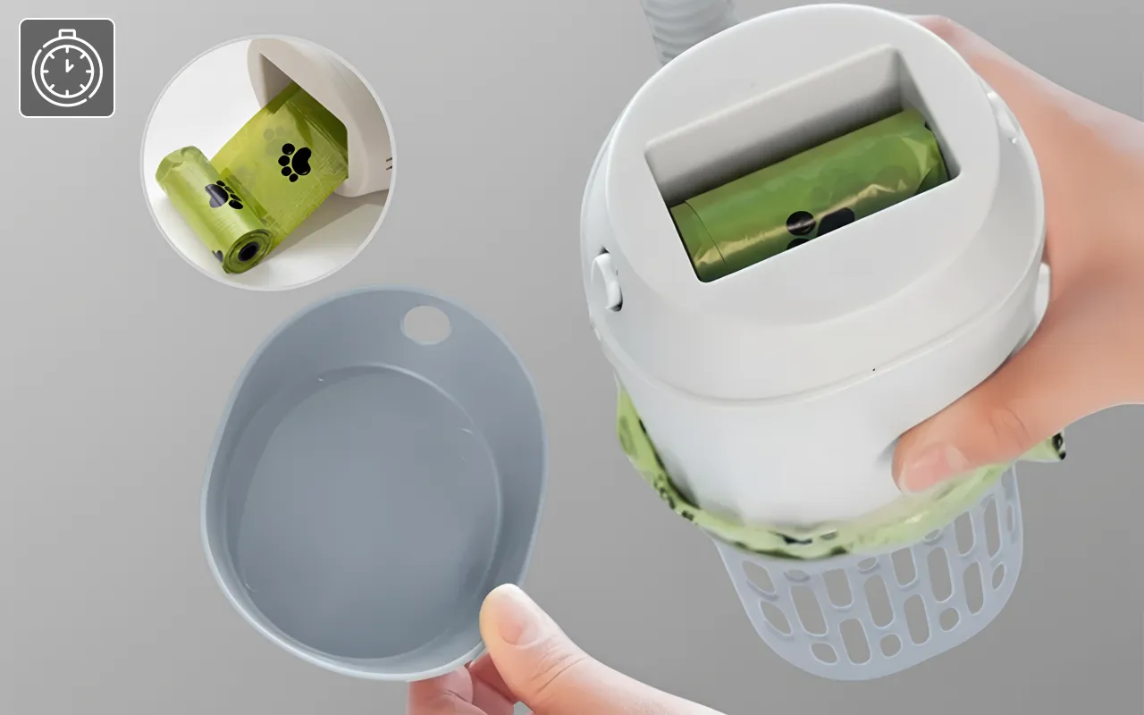 Way faster than what I was doing before! I just pick up, dump, bag it, and finished. My hands always stay clean, which I love.