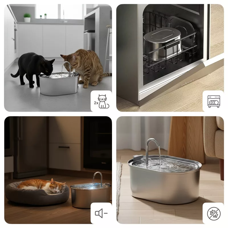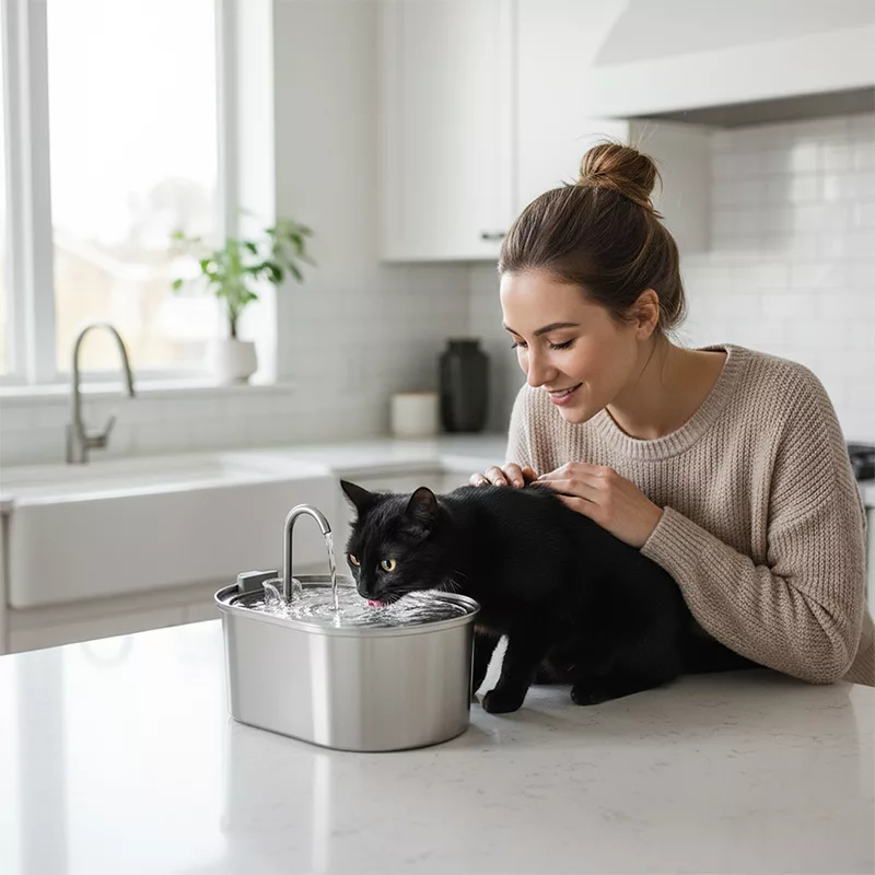 I really like how quick it is to wash the fountain. My shy cat uses it a lot and seems less stressed now. The stainless steel looks nice in my kitchen.