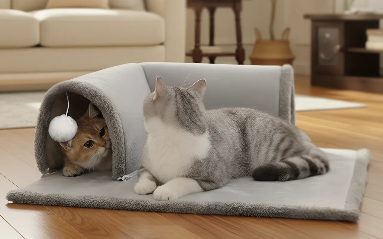 After getting this mat, my shy cat finally has her own warm corner. The tunnel is perfect for hiding and peeking out at us.