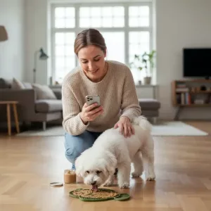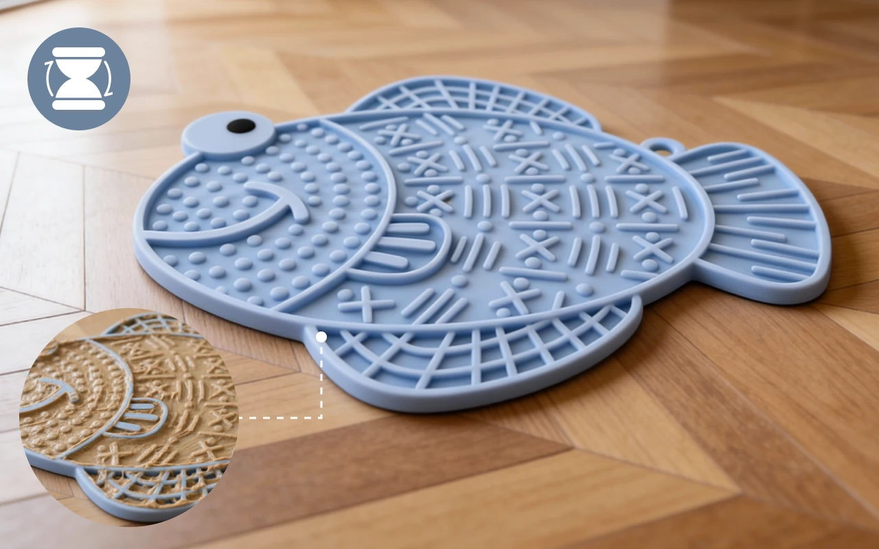 Primdog mats turn stressful moments into peaceful times quickly. Licking helps dogs and cats relax while enjoying treats. Unique patterns keep pets busy, making boredom disappear fast. Cleaning up after use is easy and hassle-free every time.