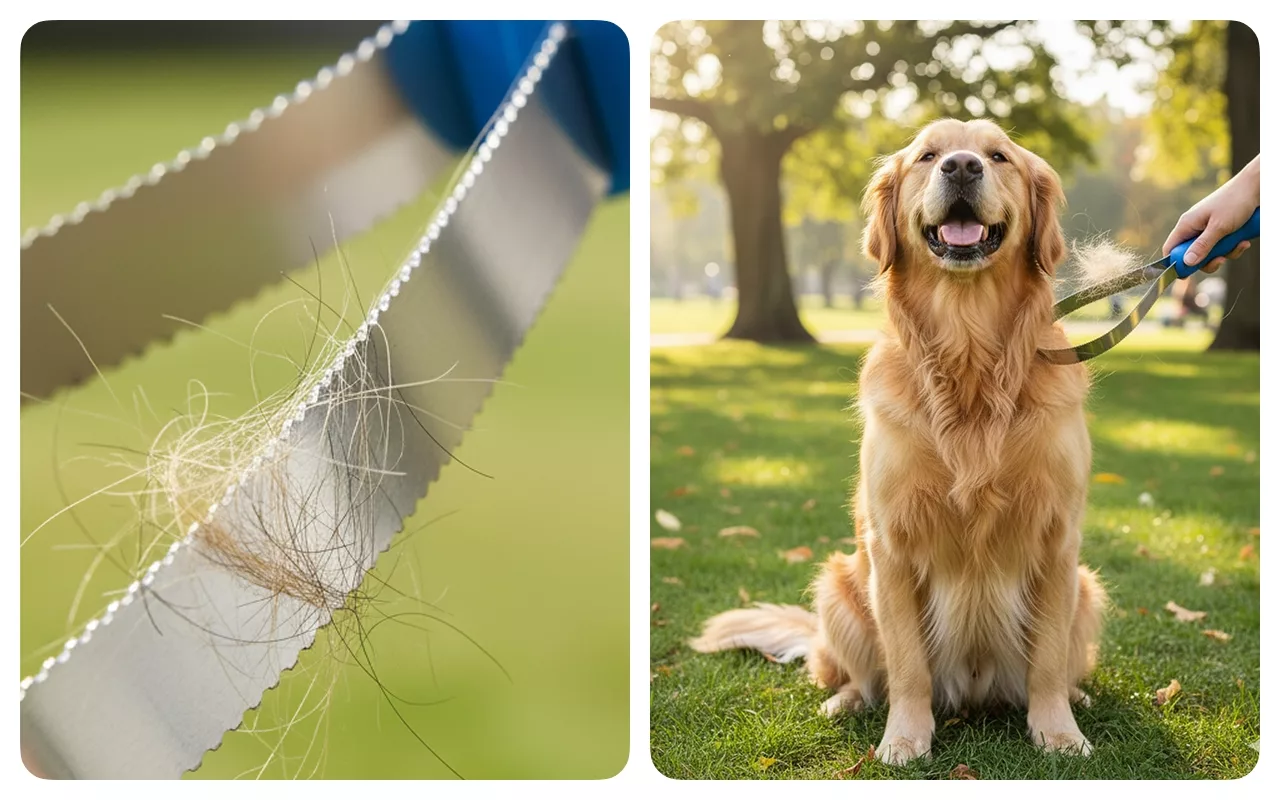 Messy fur gets everywhere after walks or playtime at home. Brushing takes too long and leaves clumps on clothes or carpets. Primdog shedding blade removes loose undercoat quickly and keeps rooms tidy.