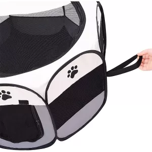 The Primdog Indoor Playpen has a zippered door that provides easy in/out access for your pet. You can roll up the door with the attached Velcro or open the zippered top to reach in and handle your pet.