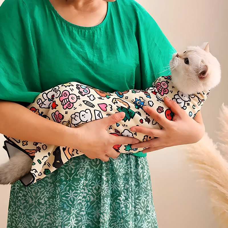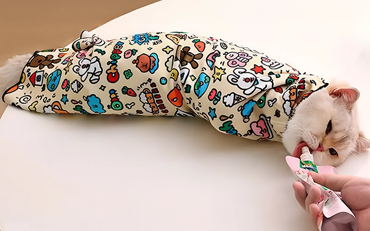 Bath time used to be chaos, but now my cat is calm in this wrap. The self-stick part holds everything in place so well. Even the pattern makes me smile.